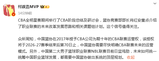 随后,媒体人付政浩发文点评:CBA全明星赛期间举行了CBA阶段总结及研讨会,篮协竞赛部部长肖红安重点介绍了职业联赛的未来改革发展思路和相关课题组计划。这个信号值得关注。