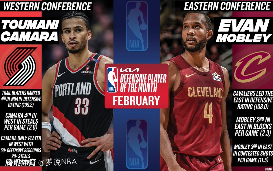 开拓者的卡马拉当选2月西部最佳防守球员。2月份,开拓者的防守效率(109.2)排全联盟第四,卡马拉的场均抢断数(2.0)排西部第四,卡马拉是西部唯一一位至少50个防守篮板、20个抢断且10个盖帽的球员。