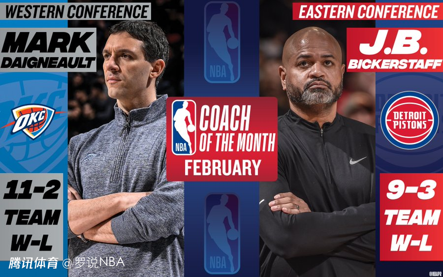 戴格诺特在2月份率领雷霆打出11胜2负的战绩,同期胜率(84.6%)排名西部第一,联盟第二(仅次于骑士的90.9%)。这是戴格诺特生涯第二次当选月最佳教练,他在本赛季的12月份也曾获得这一奖项。