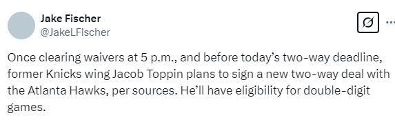 2025-03-05 07:30北京时间3月5日,根据记者Jake Fischer的报道,有消息人士透露,前尼克斯前锋雅各布-托平计划在双向合同截止时间前,与老鹰队签订一份新的双向合同。一旦他度过澄清期,他将有资格参加至少10场比赛。