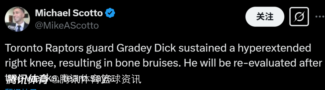 猛龙官方:迪克右膝过度伸展导致膝盖骨挫伤 将在两周后重新评估