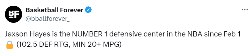 2025-03-05 09:00北京时间3月5日,美媒Basketball Forever发布动态,晒出湖人球员海耶斯的防守效率数据,并表示:“自2月1日以来,海耶斯是NBA中防守效率排名第一的中锋(防守效率值102.5,场均至少出场20分钟)。”