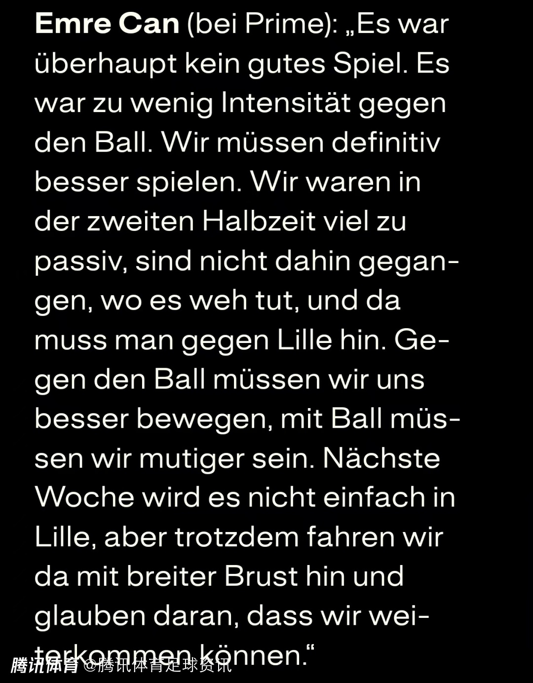 埃姆雷-詹在谈到本场比赛时表示:“这绝对算不上一场出色的比赛。我们在比赛中的压迫强度太低了,我们必须踢得更好。下半场,我们表现得过于被动,没有进入那些关键区域,而这些区域在对阵里尔时是必须占据的。我们需要在防守时更积极地移动,在控球时更果断、更有勇气。下周去里尔的客场之旅不会轻松,但我们依然会充满信心地前往,我们相信自己能够晋级。”