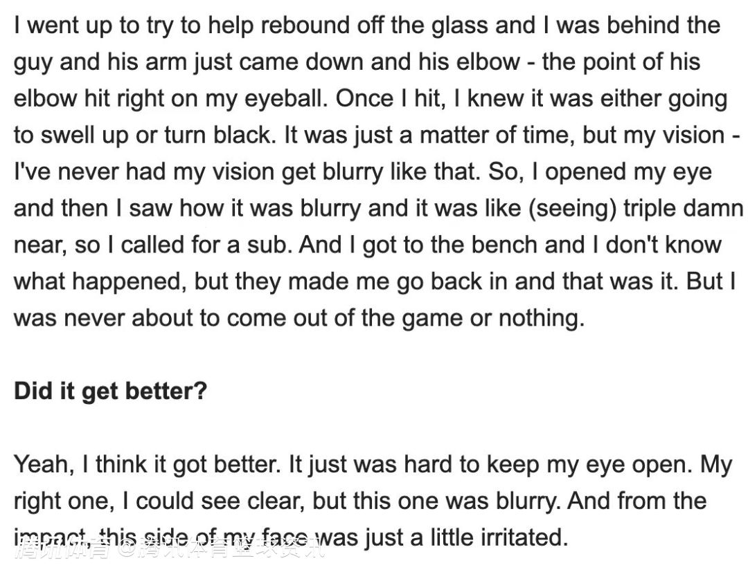 利拉德对这次受伤说道:“当时我跳起来准备在篮板附近帮忙抢篮板,站在对方身后,他的手臂突然落下,胳膊肘尖正好戳到我的眼睛。那一刻我就知道,眼睛肯定要肿起来或者淤青了,这只是迟早的事。但更让我意外的是,我的视力变得模糊了,这种情况以前从未发生过。我睁开眼睛,发现视线一片模糊,几乎看东西都是三重影。所以,我赶紧示意换人下场。回到替补席后,也不知道为什么,教练又让我重新回到场上。不过,我从未想过要放弃比赛。”