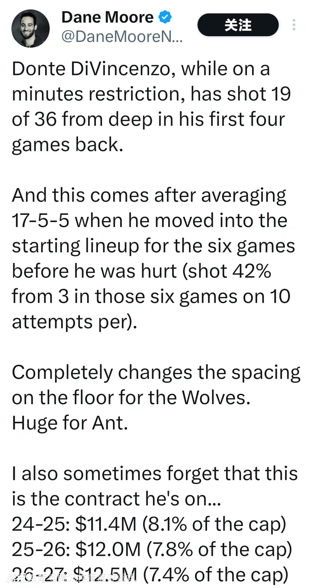 合同超值!狼记盛赞迪文琴佐:他彻底改变森林狼场上空间感