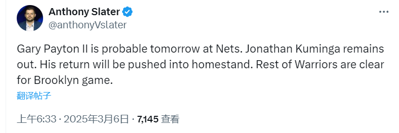 2025-03-06 07:00北京时间3月6日,勇士队记Anthony Slater更新球队伤情,小佩顿大概率在明日对阵篮网的比赛中出战,而库明加将继续缺阵。他的回归可能会推迟到球队的主场比赛期间。勇士队其他球员都已准备好参加对阵篮网的比赛。对阵篮网将是勇士五连客之旅的最后一场,随后他们将连打七个主场。