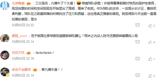 许利民提到曾凡博的表现也给出很高的评价点评:很幸运能够执教这么优秀的球员,他真正的舞台在更高级别的赛场,希望小曾踏踏实实进步。