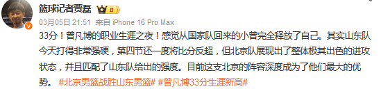 篮球记者贾磊发文点评说道:33分!曾凡博的职业生涯之夜!感觉从国家队回来的小曾完全释放了自己。其实山东队今天打得非常强硬,第四节还一度将比分反超,但北京队展现出了整体极其出色的进攻状态,并且匹配了山东队给出的强度。目前这支北京的阵容深度成为了他们最大的优势。