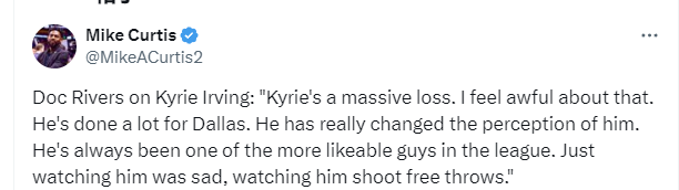里弗斯说道:“失去欧文对于独行侠是一个巨大的损失,他为达拉斯做了很多事情,他真的改变了人们对他的看法。欧文一直是联盟中深受喜爱的球员之一,看到他受伤然后坚持罚球令人感到难过。”