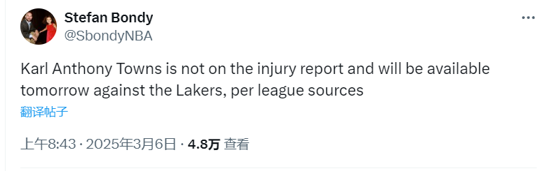 尼克斯队方面,唐斯将可以参加明日与湖人队的比赛,此前他因为个人原因错过了尼克斯队与勇士队的比赛。本场比赛之前,湖人队的战绩为39胜21负,暂时排在西部第2位,尼克斯队的战绩为40胜21负,暂时排在东部第3位。