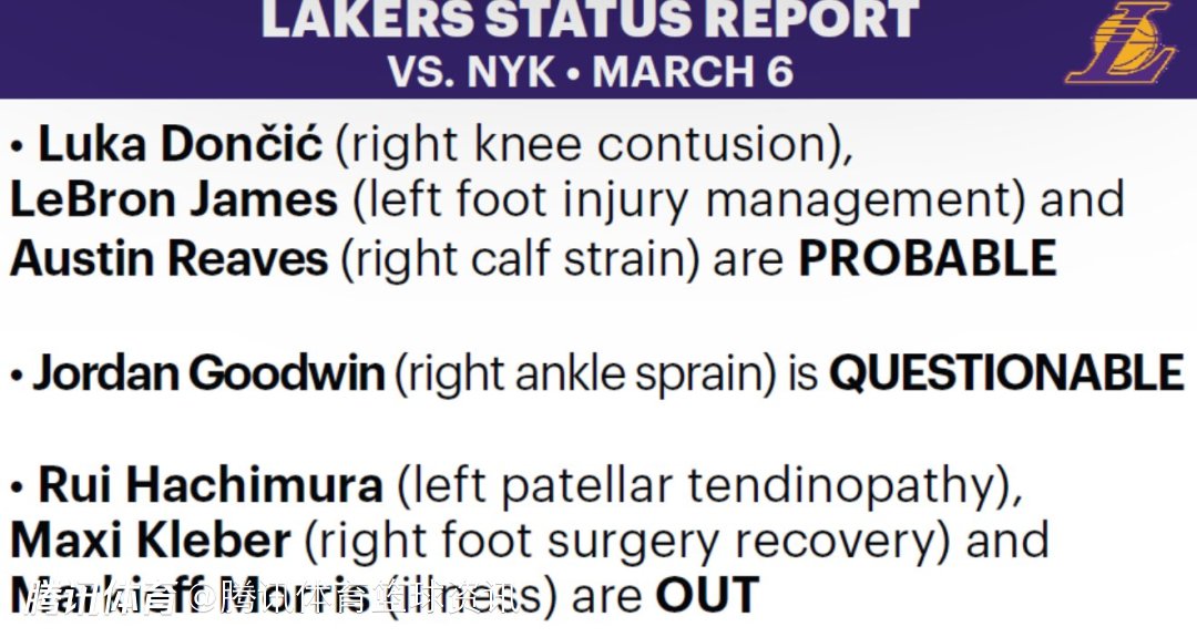 2025-03-06 09:20北京时间3月6日,湖人队发布了明日对阵尼克斯队比赛的伤病报告,其中东契奇、詹姆斯和里夫斯都是大概率出战(75%的可能出战)。具体情况如下: