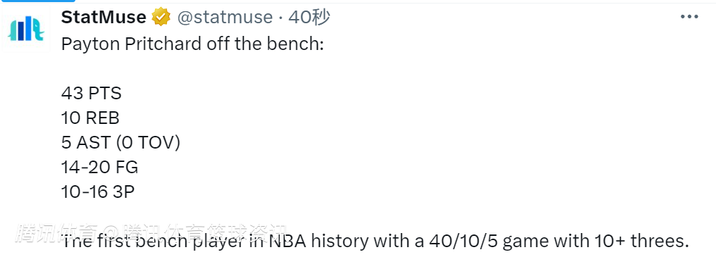 根据StatMuse发布的统计显示,普里查德成为了NBA历史上首位至少得到40分10篮板5助攻且命中10+三分球的替补球员。
