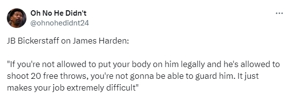 比克斯塔夫认为本场比赛裁判的吹罚尺度导致他们根本无法防守哈登,他说道:“我要对哈登的表现大加赞扬,但如果你不能允许对他进行合理身体对抗,而且还能让他获得20个罚球,那你就没办法防住他,这会让你的工作变得非常困难,因为他拥有精英级别的进攻能力。”