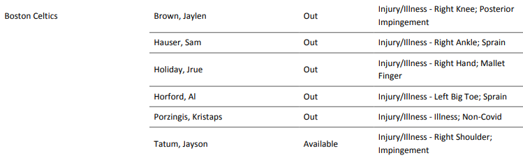 2025-03-07 08:20北京时间3月7日,凯尔特人官方更新伤情,今日对阵76人的比赛,塔图姆在伤停一场后复出,但杰伦-布朗(右膝后方撞击)、霍勒迪(右手槌状指)、霍福德(左脚大拇指扭伤)、波尔津吉斯(生病)、豪瑟(右脚踝扭伤)这5员大将缺阵。