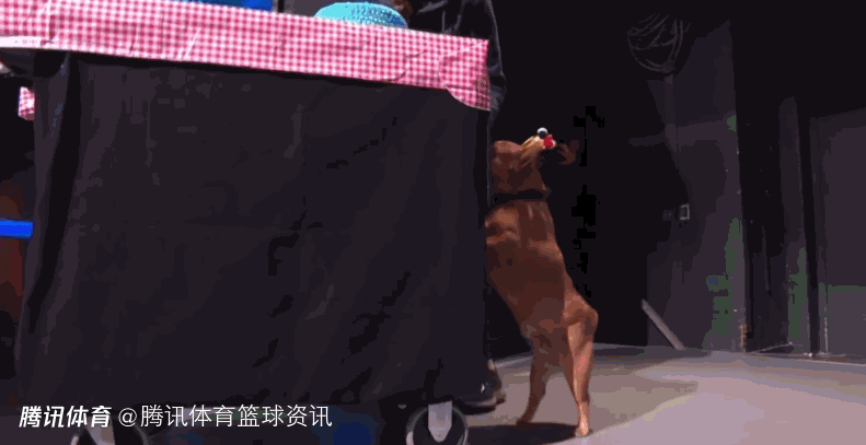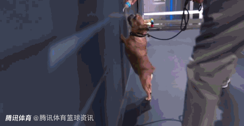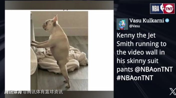大门推开后,一只小狗站立行走帮忙推动蛋糕车,随后还和肯尼-史密斯进行互动,一起跑到身后的墙壁上玩起了扶墙游戏。此前有条社媒晒出一张类似的小狗扶墙照,调侃那就是肯尼-史密斯穿上紧身西裤后做节目的模样。