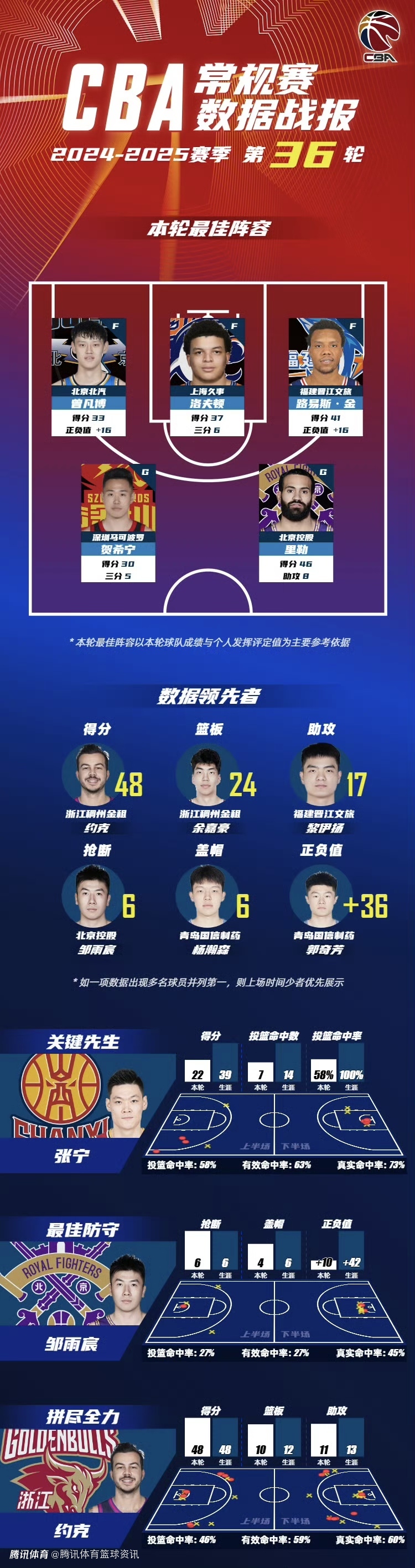 第36轮最佳阵容:北京男篮的曾凡博(33分+16正负值)、上海男篮的洛夫顿(37分6三分)、福建男篮的路易斯-金(41分+16正负值)、深圳男篮的贺希宁(30分5三分)、北控男篮的里勒(46分8助攻)。
