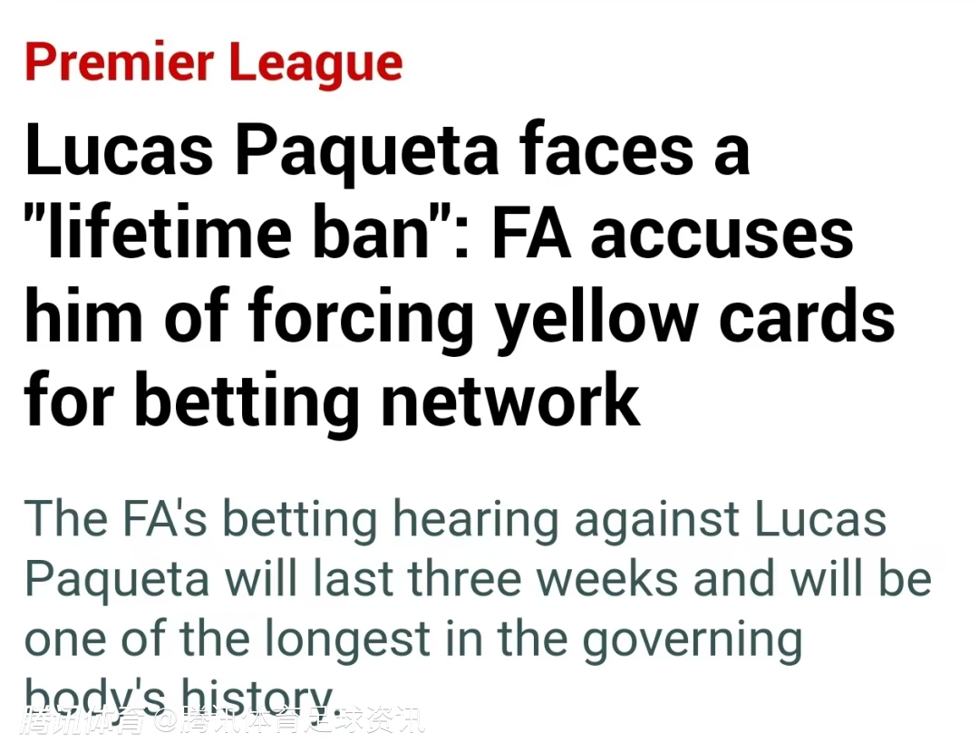据报道,此次听证会预计将耗时三周,有望成为英足总历史上最长的听证程序之一。帕奎塔在2024年5月被指控违反博彩规则,本月他将面临这场为期三周的听证会。英足总计划对这位27岁的西汉姆联中场球员实施终身禁赛。