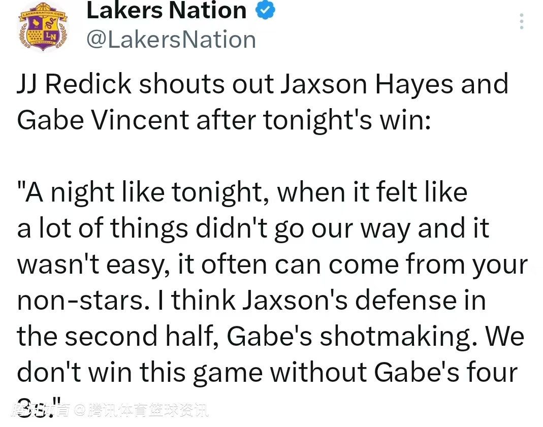 最后,雷迪克还表示,赛后有很多教练都向他提到过湖人队的球员总是那么努力打球,他为球队能树立起这样的声誉而感到自豪。