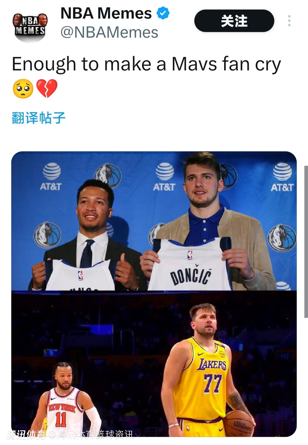 美国媒体NBA Memes在社交媒体上晒出了湖人球星东契奇和尼克斯球星布伦森的同场照片,并配文道:“足以让独行侠球迷泪目”。布伦森在2018年选秀大会中以第2轮第33顺位被独行侠选中,效力4个赛季后加盟尼克斯。东契奇则在交易截止日前与浓眉互换来到湖人。