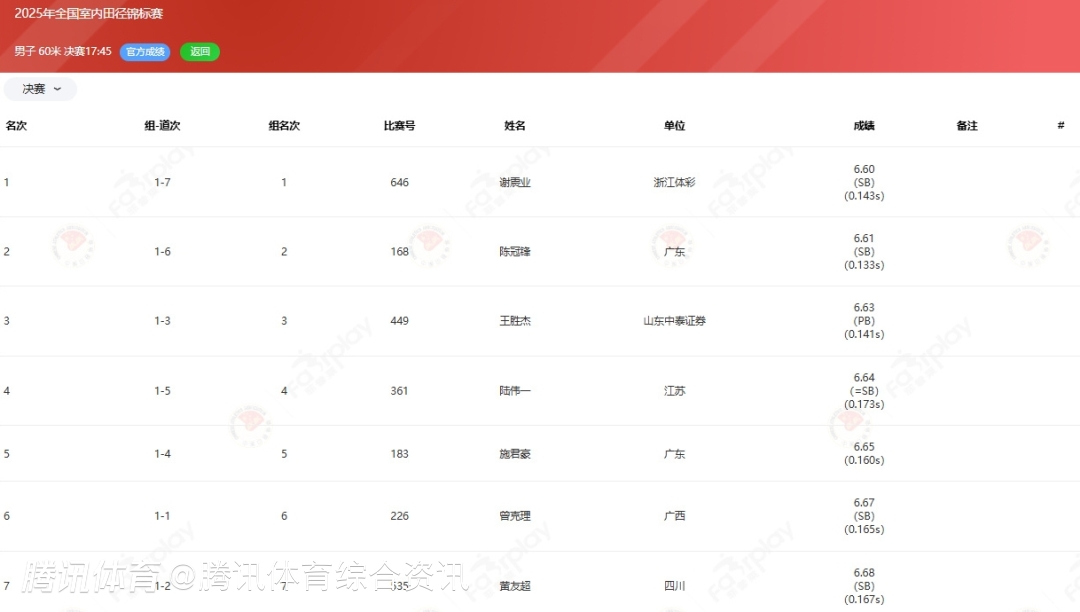2025-03-07 18:30北京时间3月7日,2025年全国室内田径锦标赛男子60米决赛在济南山东省体育训练中心田径馆激烈上演。31岁的老将谢震业以6.60秒的成绩强势夺冠,刷新赛季最佳。陈冠锋以6.61秒的成绩位列第二,山东本土选手王胜杰则以6.63秒获得第三。