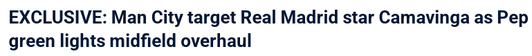 2025-03-08 07:50北京时间3月8日,根据FootballTransfers的报道显示,曼城正在考虑在今夏对皇家马德里中场卡马文加提出报价,认为这位22岁的法国中场是京多安和B席的理想接班人。