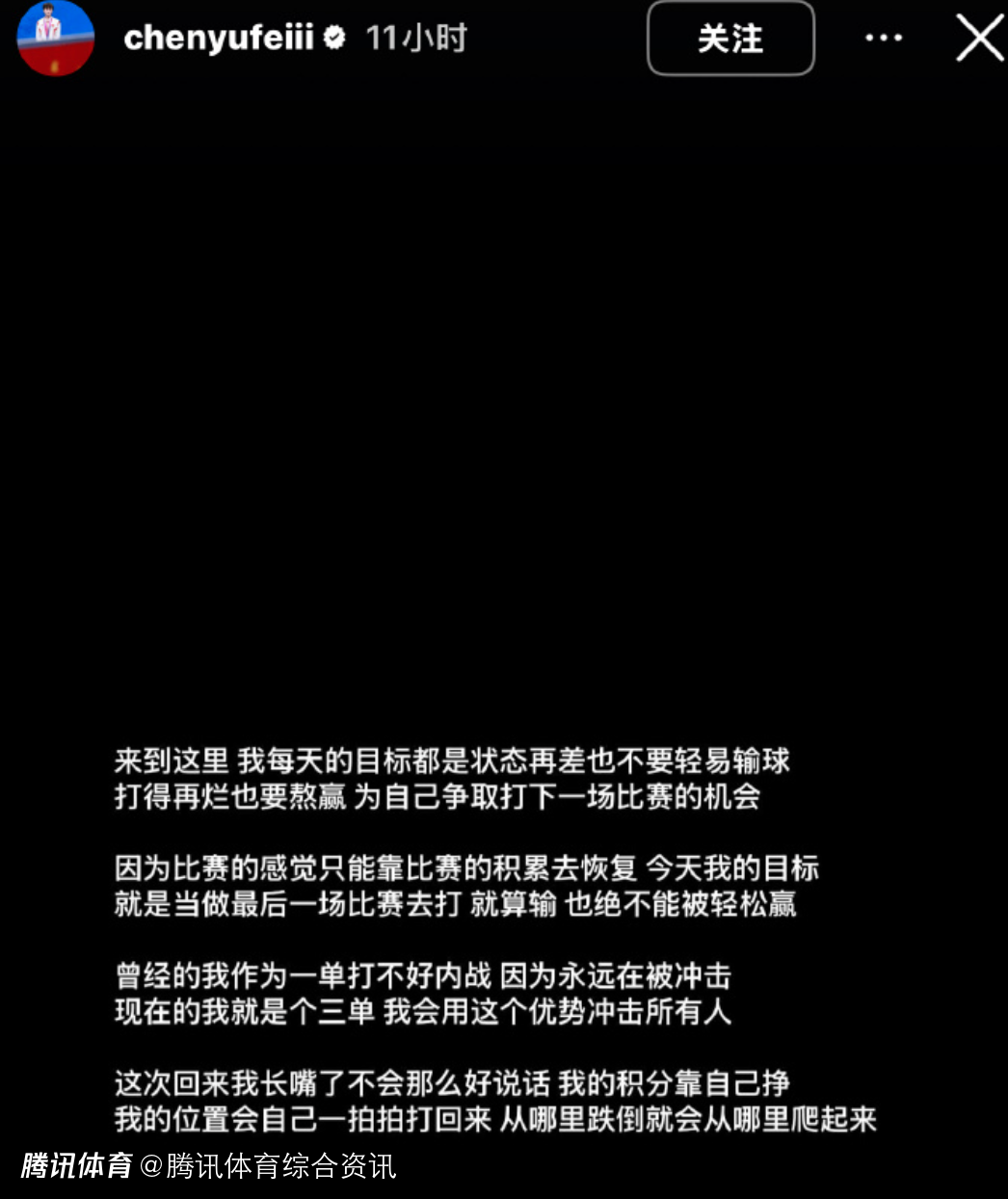 陈雨菲在个人社媒写道:“来到这里,我每天的目标都是状态再差也不要轻易输球。打得再烂也要熬赢,为自己争取打下一场比赛的机会。曾经的我作为一单打不好内战,因为永远在被冲击。现在的我就是个三单,我会用这个优势冲击所有人。我的积分靠自己挣,我的位置会自己一拍拍打回来,从哪里跌倒就会从哪里爬起来。”