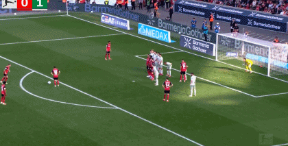 第7分钟,勒沃库森后卫横传失误,A席拿球横传给斯塔格,斯塔格分给包抄到位的斯赫米德,斯赫米德近距离捅射死角得手,不莱梅完成闪击,1-0。