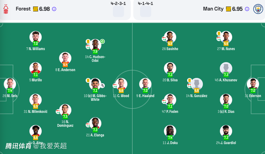 曼城首发:31-埃德森、24-格瓦迪奥尔、3-鲁本-迪亚斯、45-胡桑诺夫、27-努内斯、9-哈兰德