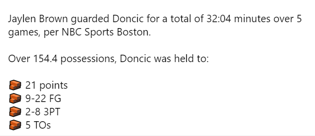 据NBC体育波士顿报道,在五场总决赛中,杰伦-布朗单防东契奇的总时长为32分04秒。面对布朗的防守时,东契奇的数据被限制为21分,投篮22投9中,三分球8投2中,出现5次失误。