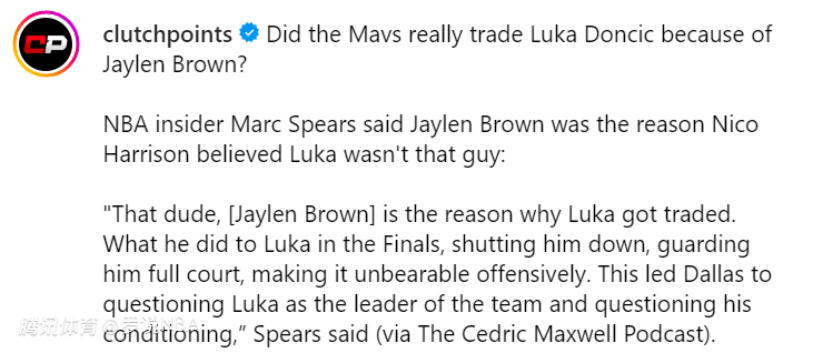 Spears在播客节目上说道:“他(布朗)在总决赛中对卢卡的所作所为,全场紧逼防守,让卢卡在进攻端举步维艰,这让达拉斯方面开始质疑卢卡作为球队领袖的能力,也怀疑他的身体状态是否良好。”