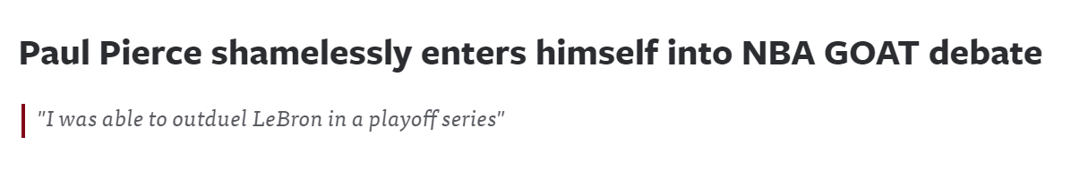 皮尔斯在节目中表示:“我不介意人们说勒布朗(詹姆斯)是GOAT。我也不介意人们说斯蒂芬-库里也能参与GOAT的讨论。但我想说,我在三分球大赛中曾击败过库里,在季后赛系列赛中也战胜过勒布朗。我只是想说,如果我们对他们有这样的评价,而你们又如此推崇这些家伙,那这对你们口中的我这个‘伙计’来说,意义可就大了。”