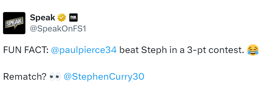 皮尔斯确实在三分大赛上击败过库里,他是2010年全明星三分大赛冠军,而那是库里第一次参加三分大赛。皮尔斯参加的这档播客节目也转发了当年皮尔斯击败库里的视频,配文写道:“有趣的事实,皮尔斯在三分大赛上击败过库里,要重赛一场吗?@斯蒂芬-库里。”