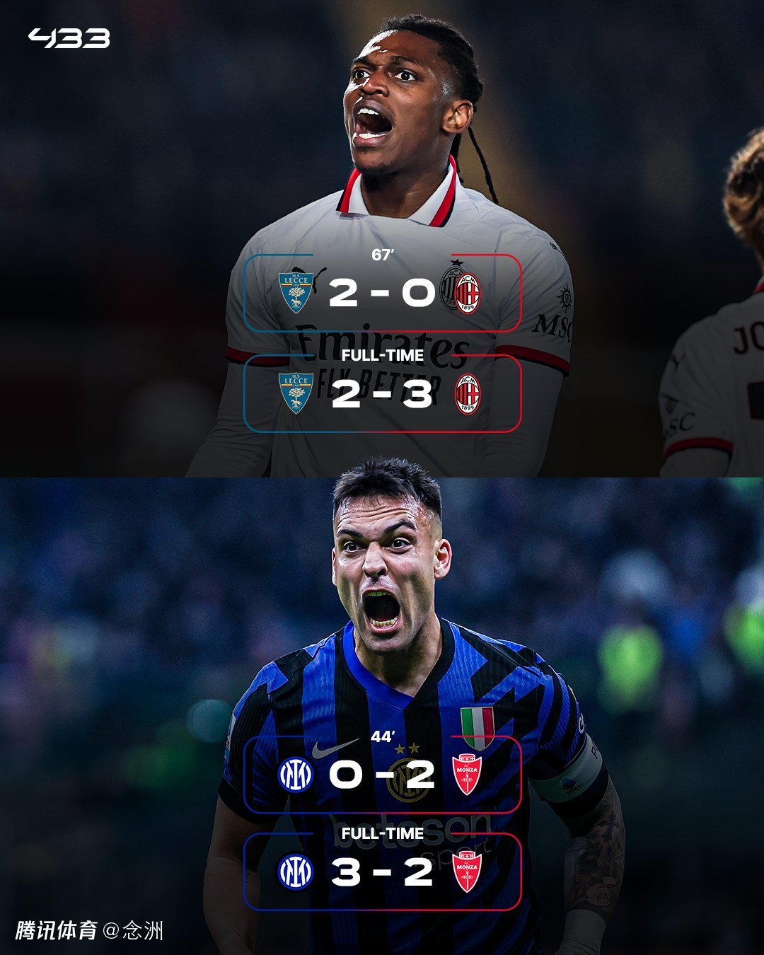 神奇3-2!米兰双雄让二追三大逆转:蓝黑4分领跑 红黑终结3连败
