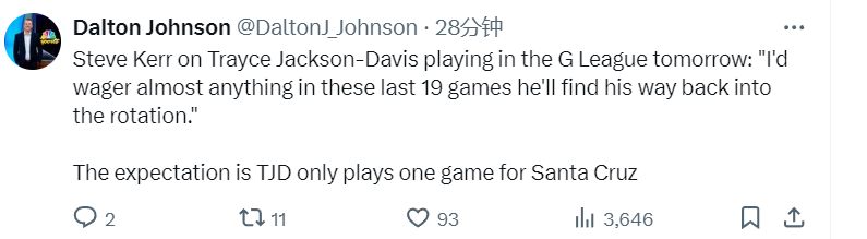 谈到了特雷斯-杰克逊-戴维斯参加G联赛的情况时,科尔表示:“我几乎可以肯定,在接下来的19场比赛中,他将重新回到球队的轮换阵容中。”科尔还提到,杰克逊-戴维斯预计将只为圣克鲁斯勇士队打一场比赛。