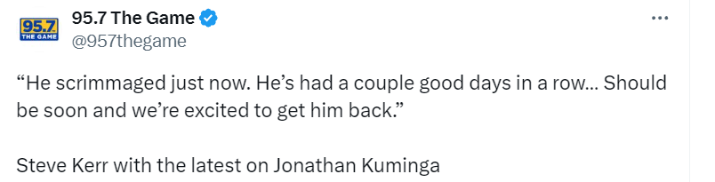 关于库明加的伤情进展,科尔说道:“他刚刚参加了队内对抗赛。他已经连续几天表现出色,应该很快就能回归,我们都很期待他回来。”