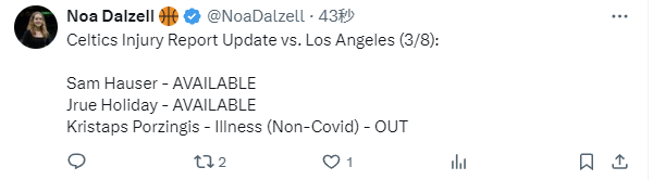 2025-03-09 08:30北京时间3月9日,NBA常规赛继续进行,凯尔特人队对阵湖人队。赛前,凯尔特人队官方宣布,波尔津吉斯因病将缺席本场比赛。