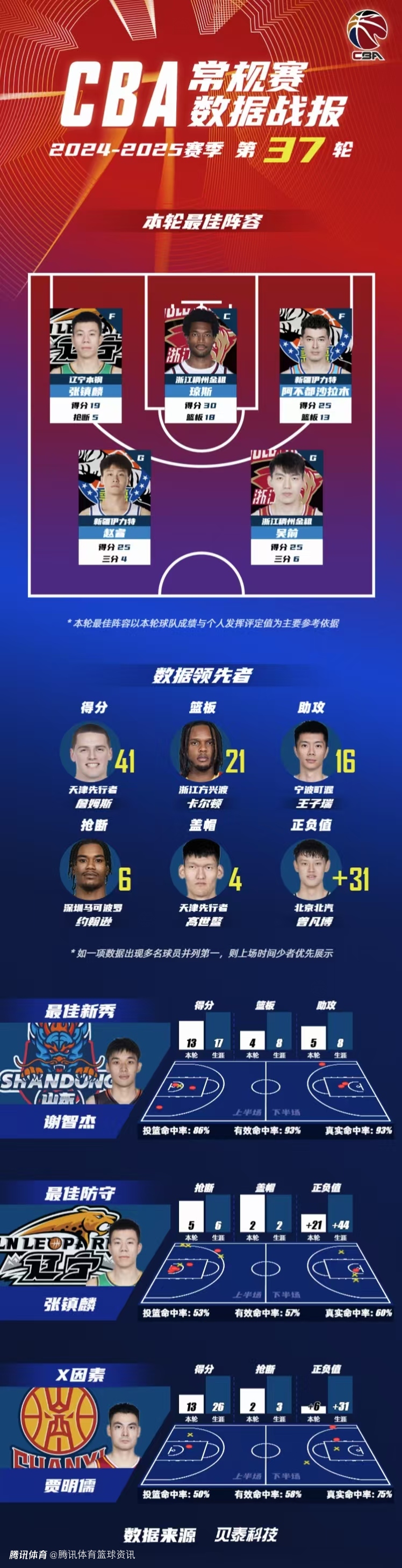 2025-03-09 09:30北京时间3月9日,CBA联赛常规赛第37轮结束较量,CBA官方发布本轮数据战报,来自辽宁队的张镇麟和新疆队的赵睿领衔本轮最佳阵容。
