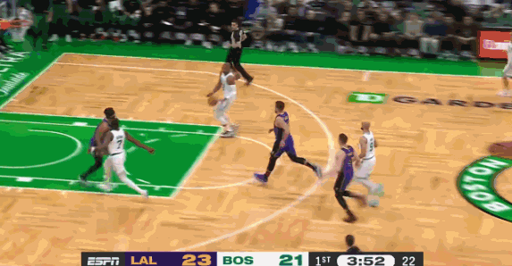 湖人半场落后绿军4分!詹姆斯14+8+7塔图姆22分 东契奇面部两次中招