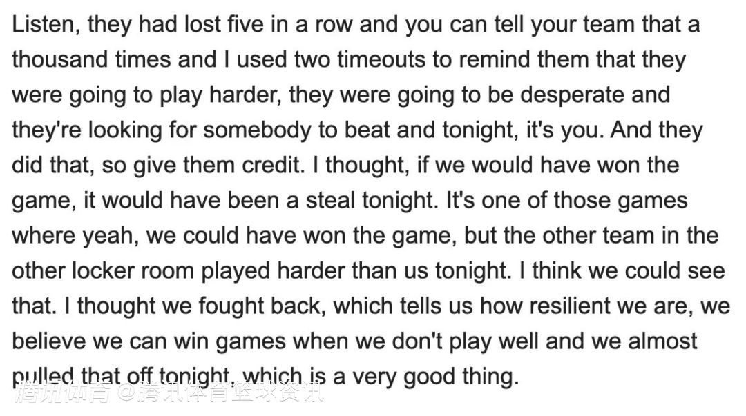 “不过,我觉得我们已经尽力反击了,这展现了我们的韧性。我们始终相信,即使状态不佳,我们也有能力赢下比赛,而今晚我们几乎就做到了。这本身就是一件非常积极的事情。”