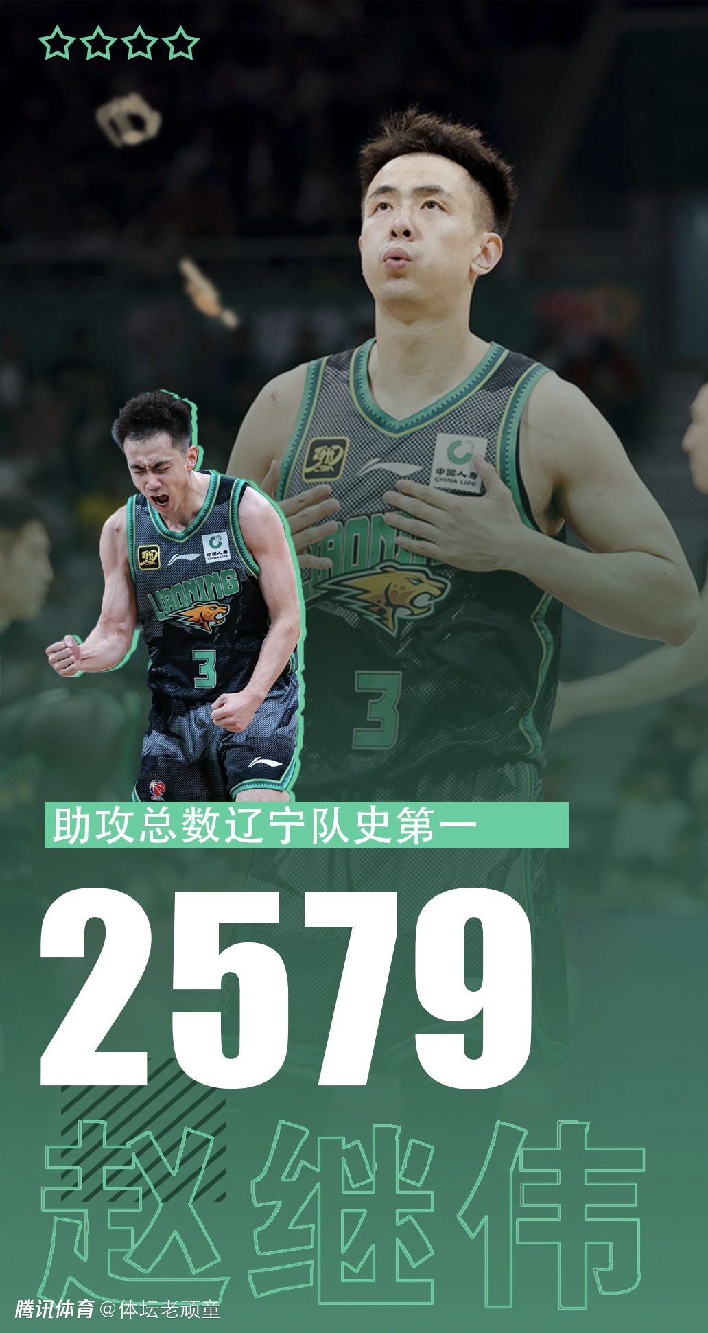 赵继伟此役发挥极为出色,三分10中7砍下全队最高的23分,外加全场并列最高的9次助攻以及2抢断,正负值+28全队第二高。赵继伟本场送出9次助攻,其CBA生涯助攻数达到2581次,超越郭艾伦辽宁生涯2579次助攻,正式加冕辽宁队史助攻王。从2013年升入辽宁一线队至今赵继伟已为球队连续效力12个赛季,终成队史助攻王!