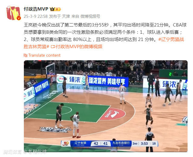 “王岚嵚今晚仅出战了第二节最后的3分55秒,其平均出场时间降至21分钟。CBA球员想要拿到B类合同的一次性激励条款必须满足两个条件:1、球队进入季后赛;2、球员常规赛出勤率达 80%以上,且场均出场时间达到 21 分钟。”该媒体人在社媒上写道。