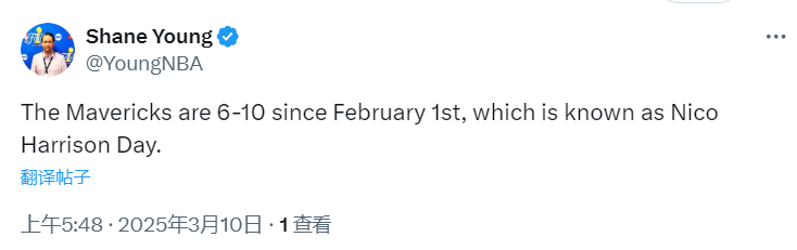 名记Shane Young不忘对哈里森开启嘲讽模式。他写道:“自从2月1日(当地时间)以来,独行侠的战绩是6胜10负,而那一天是众所皆知的‘哈里森日’。”Young提到的哈里森日,就是独行侠交易东契奇的日子。他的魔咒还在继续。