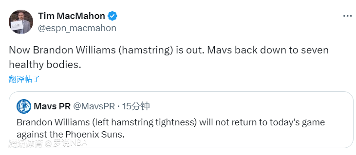此后,独行侠官方宣布,布兰登-威廉姆斯也退出比赛,问题是左腿筋紧张。MacMahon转发官方伤病报告后写道:“随着布兰登-威廉姆斯的伤退,独行侠只剩7名健康球员了。”