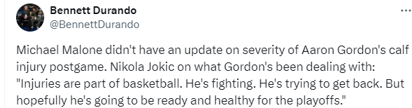本场比赛,戈登仅出战7分钟就因右小腿紧绷伤退,约基奇在谈到此事时表示:“首先,戈登是一名非常出色的防守球员,他为我们打得非常好。但伤病是篮球运动的一部分,他在战斗,在努力尝试复出。但我更希望他能做好准备,并且能以健康状态参加季后赛。”