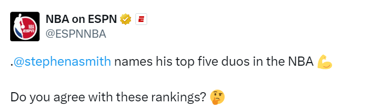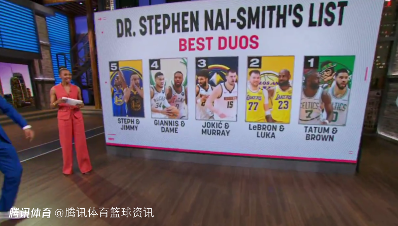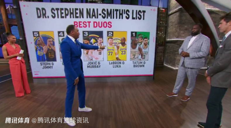 排在第1的是塔图姆和布朗。A-史密斯情绪激动地喊道:“不只是因为他们是上赛季的冠军,不只是因为他俩都能场均拿到20多分,还因为他们在自己的主场把宿敌湖人打爆了。” 赛季至今,塔图姆场均27.2分8.9篮板5.8助攻,布朗场均23.2分6.1篮板4.8助攻。