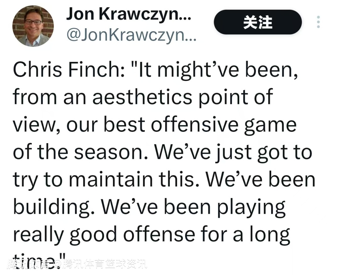 芬奇:森林狼送出38次助攻 从观赏性来说这是赛季最佳进攻表现