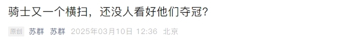2025-03-10 13:40北京时间3月10日,NBA常规赛继续进行,骑士队112-100击败雄鹿队,豪取14连胜。赛后,媒体人苏群发文点评比赛,并谈到了骑士队的争冠前景。
