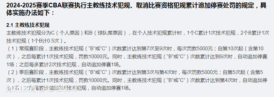 根据CBA规定,球队席出现技术犯规时会被记录为B类型的技术犯规,2个B累计1次技术犯规,也就是说1个B只有0.5次技术犯规。只有主教练因个人原因领到的技术犯规(被记录为C类型),才累计为1次技术犯规。