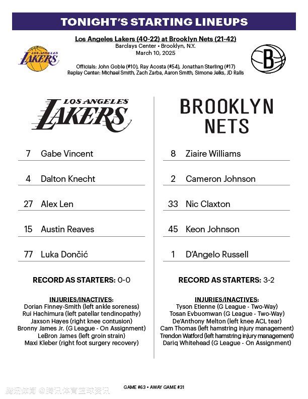 湖人vs篮网首发出炉:东契奇领衔克内克特莱恩在列 拉塞尔再战旧主