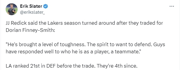 雷迪克表示:“芬尼-史密斯让球队的韧性提高了一个等级,他带来了想要努力防守的精神,球员们对于他打球的方式和拥有这样一个队友反应良好。”根据数据统计显示,在芬尼-史密斯被交易到湖人队前,湖人队的防守排名联盟第21位,交易后,湖人队的防守升至联盟第4位。但本场比赛,芬尼-史密斯将缺阵无缘对决旧主。